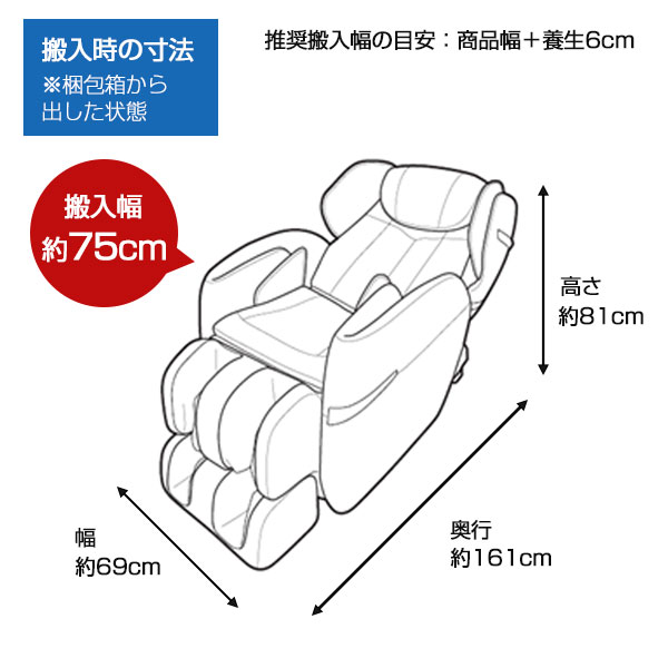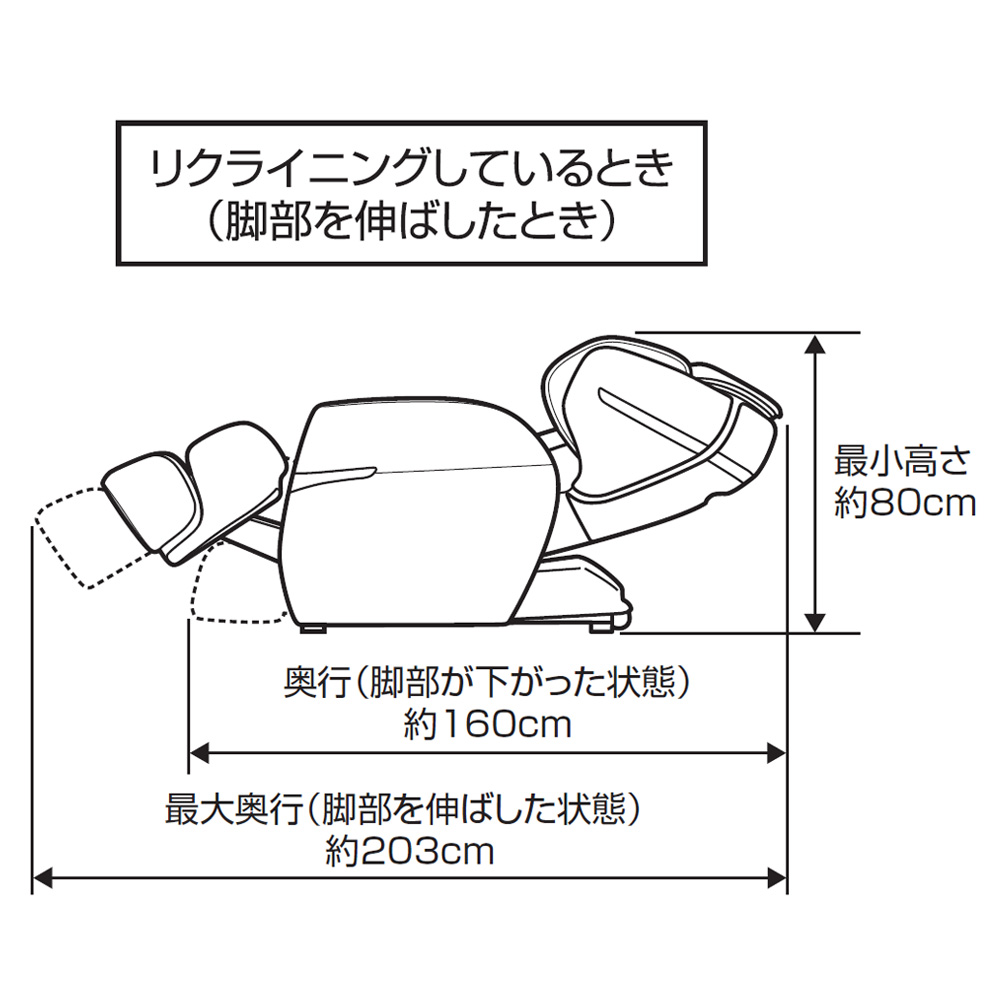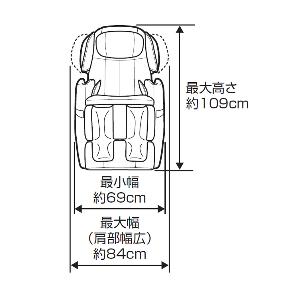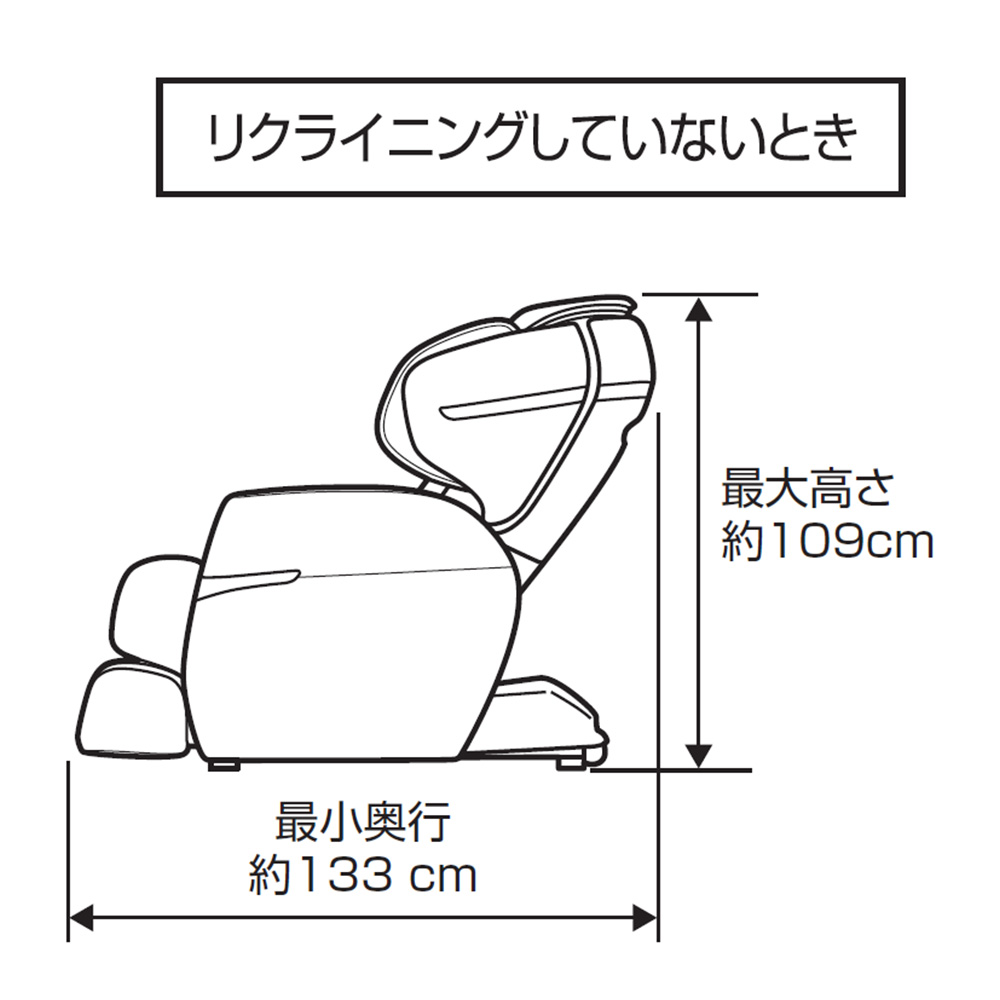 | 寸法 | 通常(約):幅69×奥行133×高さ109cm(脚部収納、肩部を閉じたとき) リクライニング時(約):幅84×奥行203×高さ80cm(脚部最大使用、肩部を開いたとき) >座面などの詳しい寸法情報(PDF) |