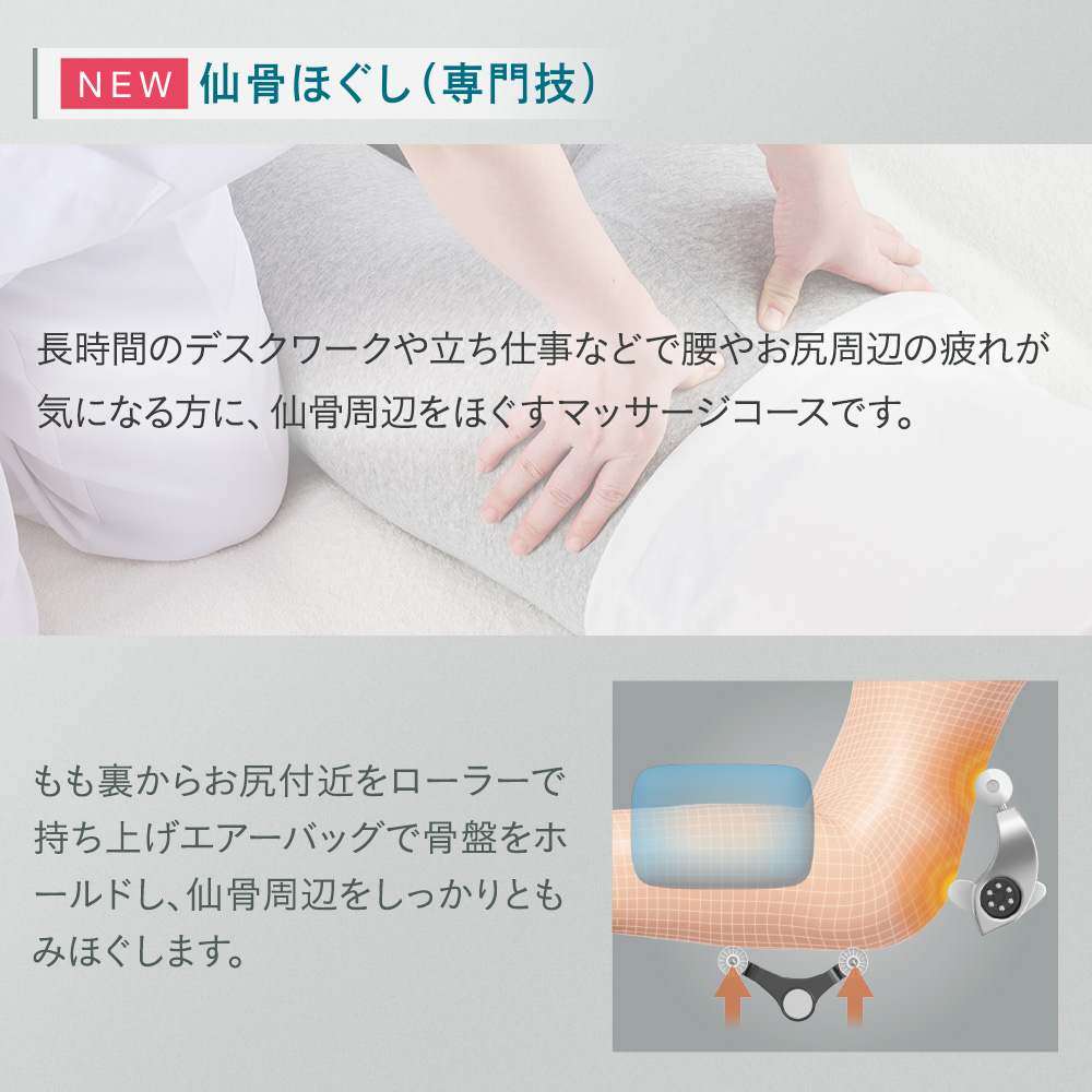 座りっぱなしや立ち仕事などで腰やお尻付近に溜まった疲れを集中的にほぐす「仙骨ほぐし」を搭載。また、その日の疲れに合わせて選べる6種類の「マッサージコース」と疲れやすい部位を重点的にマッサージする6種類の「専門技」をご用意しました。