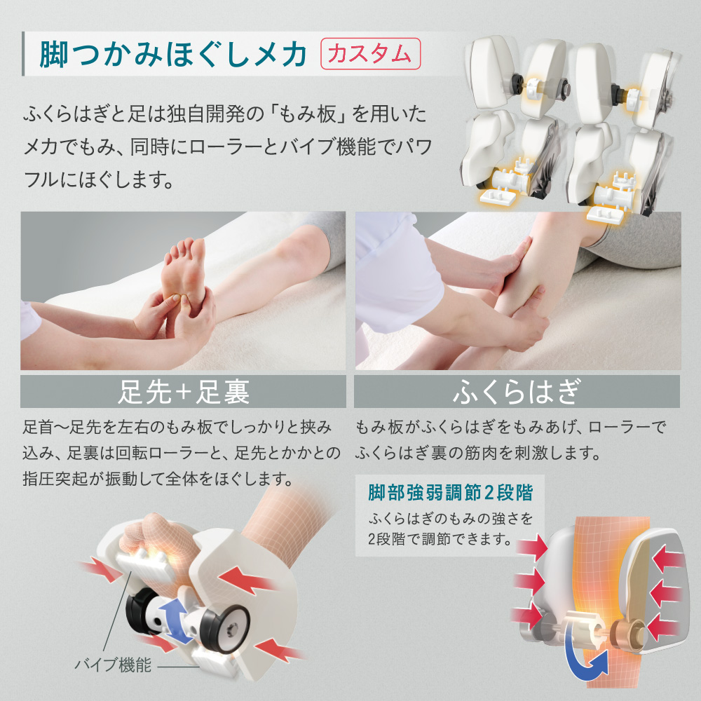 ふくらはぎと足は独自開発の「もみ板」を用いたメカでもみ、同時にローラーとバイブ機能でパワフルにほぐします。