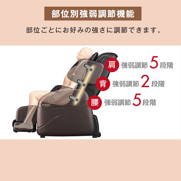 もみ玉の突出量(最大約8cm)の調節で、肩5段階、背2段階、腰5段階とそれぞれの部位ごとに強弱を設定できます。あなたや家族の好みに合わせて快適にマッサージをお楽しみいただけます。