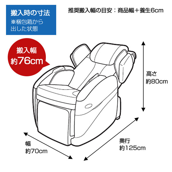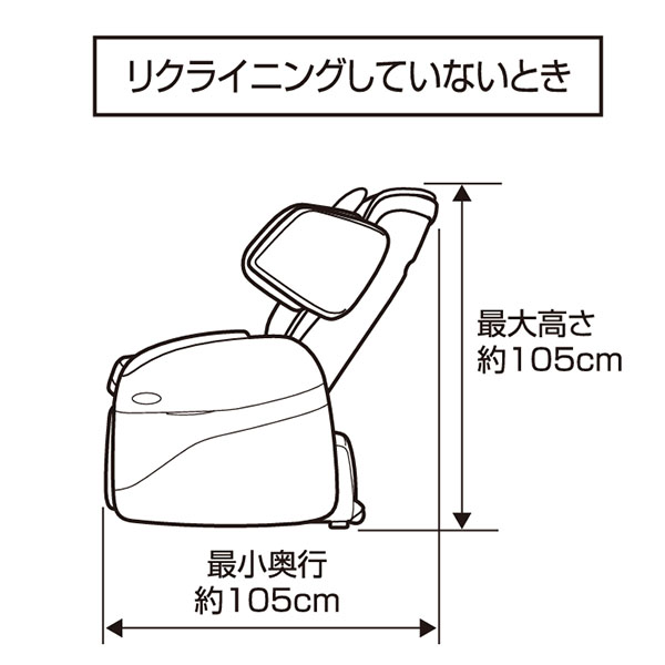 | 寸法 | 通常(約):幅70×奥行105×高さ105cm(リクライニングしていない状態) リクライニング時(約):幅87×奥行184×高さ81cm(肩・脚部最大使用時) >座面などの詳しい寸法情報(PDF) |