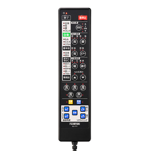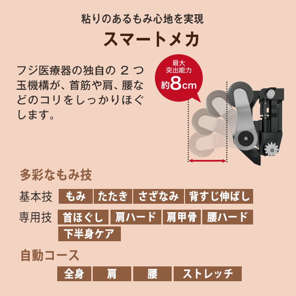 独自のもみ玉突出設計により、背もたれの厚みを抑えた薄型デザインを実現。ソファとして使用する際は、もみ玉が収納されて気になりません。また、もみ玉直径を他機種より大きくすることで、もみこむようなやさしい力強いマッサージが可能です。フジ医療器の独自の2つ玉機構が、首筋や肩、腰などのコリをしっかりほぐします。