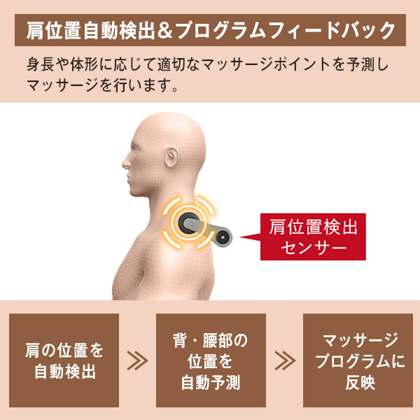 自動的に肩位置を検出するセンサーを搭載。検出した肩位置から、背・腰部の位置を自動予測し、マッサージプログラムに反映することで、使う人に適したマッサージを行います。