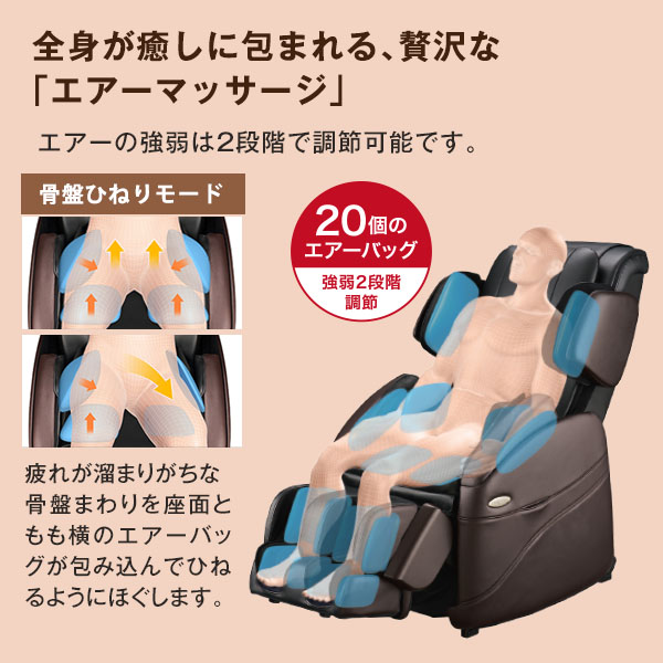 20個のエアーバッグが、肩・腕・骨盤まわり・脚部をやさしく、しっかりほぐします。腕マッサージは、ひじ下から手までを包み込んでマッサージします。さらに、新搭載の「骨盤ひねりモード」は、座面ともも横にあるエアーバッグで骨盤まわりをひねるような動作でマッサージします。