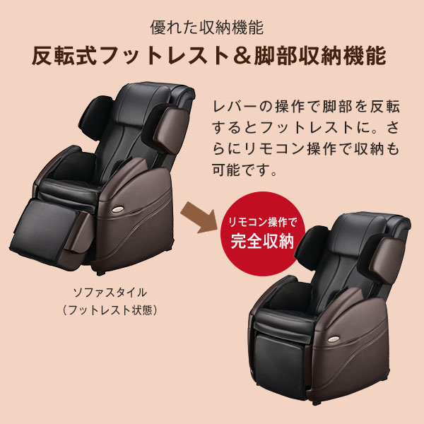 脚部を反転させると、ゆったりくつろげるフットレストとしてお使いいただけます。さらにリモコン操作で完全収納することもできます。