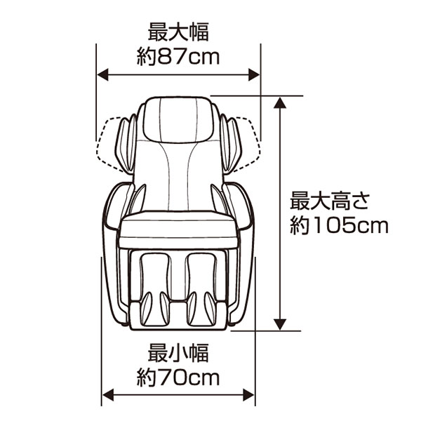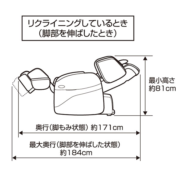 | 寸法 | 通常(約):幅70×奥行105×高さ105cm(リクライニングしていない状態) リクライニング時(約):幅87×奥行184×高さ81cm(肩・脚部最大使用時) >座面などの詳しい寸法情報(PDF) |