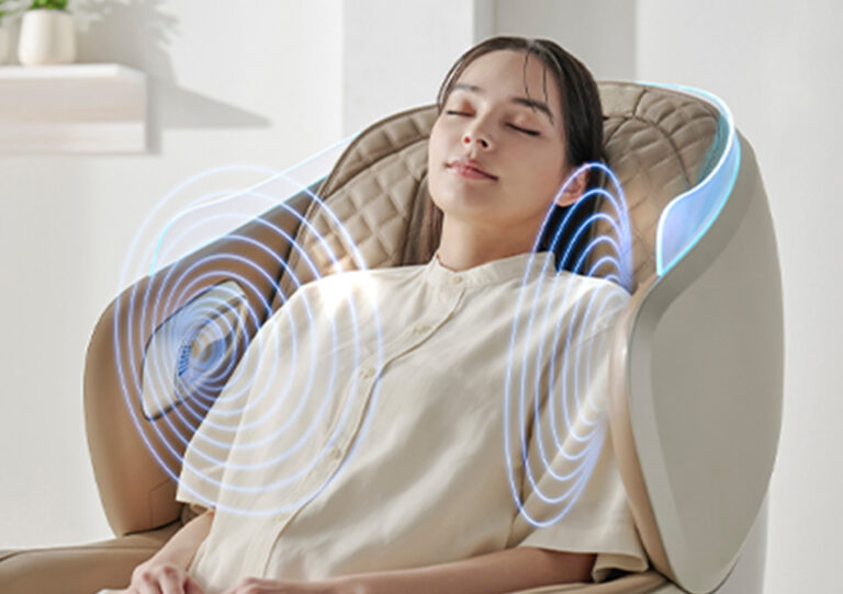 包み込まれるような音響空間でスマホ等とつないであなた好みの音楽を聞きながらマッサージできます。また、内蔵された5種類の癒し音楽も搭載しています。