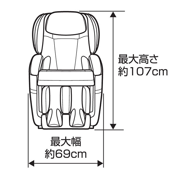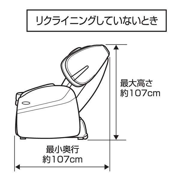 | 寸法 | 通常(約):幅69×奥行107×高さ107cm リクライニング時(約):幅69×奥行181×高さ83cm(脚部最大使用) >座面などの詳しい寸法情報(PDF) |