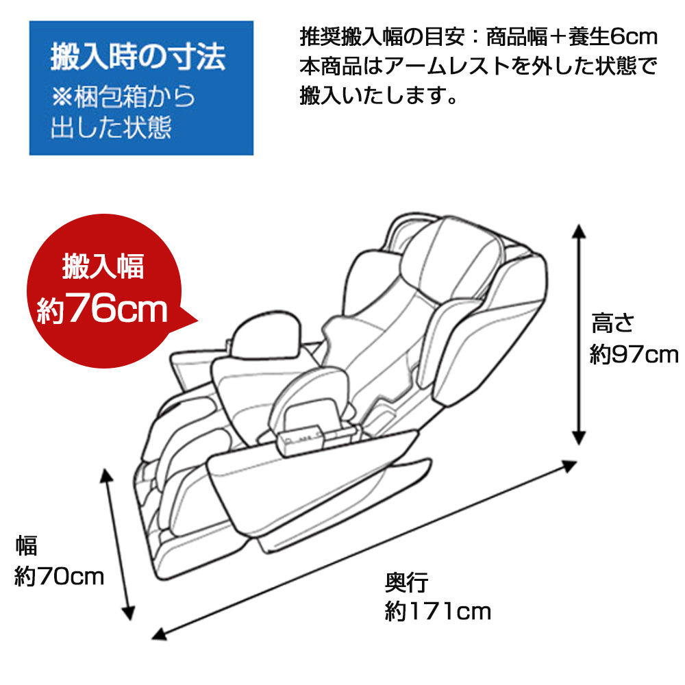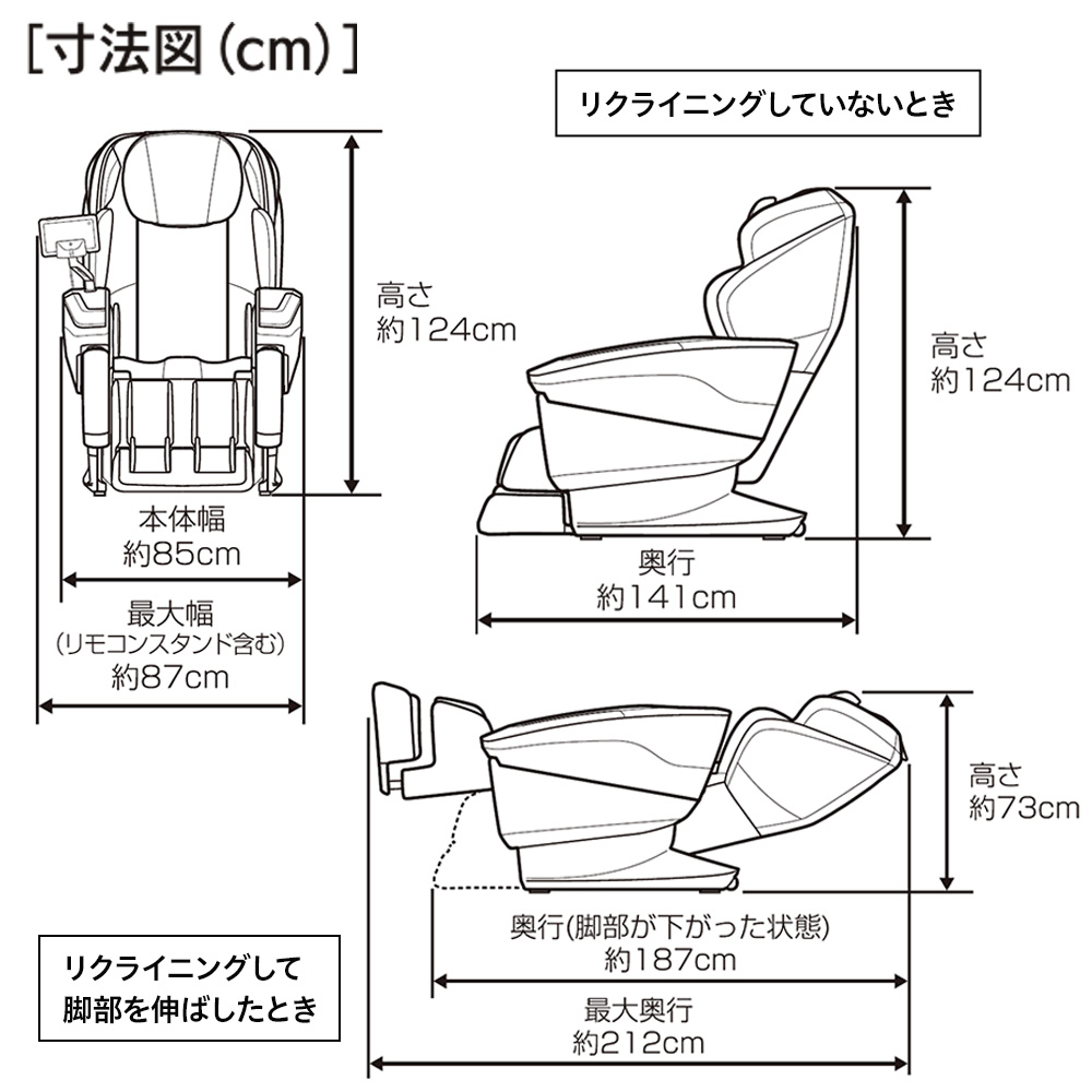 リクライニング時(約):幅85×奥行212×高さ73cm (脚部最大使用) >座面などの詳しい寸法情報(PDF) |