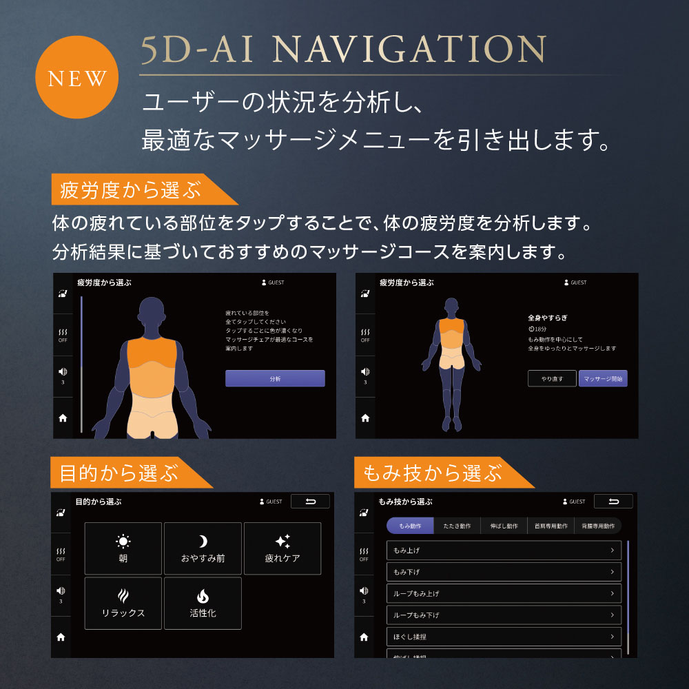 大型タッチパネルの直感的な操作で、ユーザーの疲れている部位をタッチ選択、AIが分析してコースを提案する「疲労度から選ぶ」、他に「目的から選ぶ」「コース履歴」などユーザーの身体の状態や疲れに寄り添った適切なメニューを引き出し、感動のマッサージ体験へ導きます。