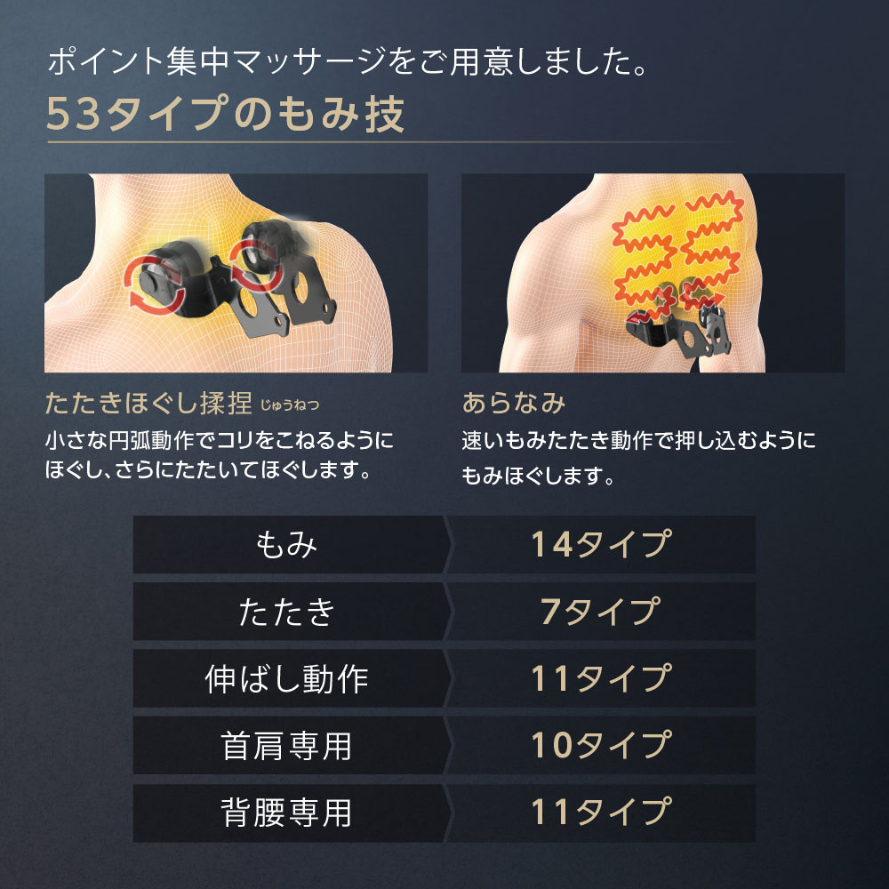 こだわりのもみや揉捏動作、独自のマッサージ動作で気になるポイントを集中マッサージします。