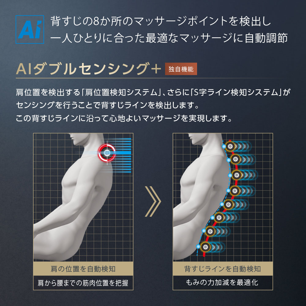 肩位置を検出する「肩位置検知システム」によりマッサージポイントを割り出し、さらに「S字ライン検知システム」が8か所のセンシングを行うことで背すじラインを検出します。この背すじラインに沿って「5D-AIメカPLUS」が均一に自動調節された心地よいマッサージを実現します。