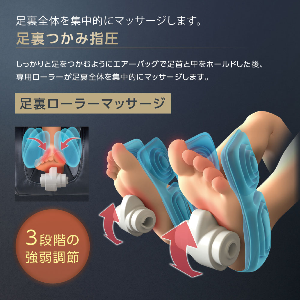 しっかりと足をつかむようにエアーバッグで足首と甲をホールドした後、専用ローラーが足裏全体を集中的にマッサージします。