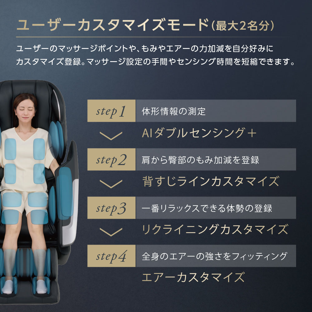 ユーザーの肩位置、背すじライン、エアーの力加減、リクライニング角度を細かく調節しマッサージチェアに登録できます。(最大2名分)