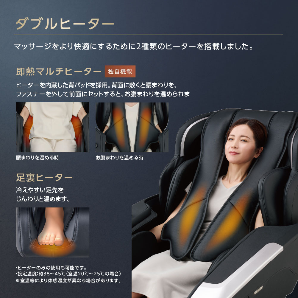 ヒーターを内蔵した背パッドを採用。背面に敷くと腰まわりを、ファスナーを外して前面にセットするとお腹まわりを温められる「即熱マルチヒーター」と、冷えやすい足先をじんわり温める「足裏ヒーター」を搭載しています。